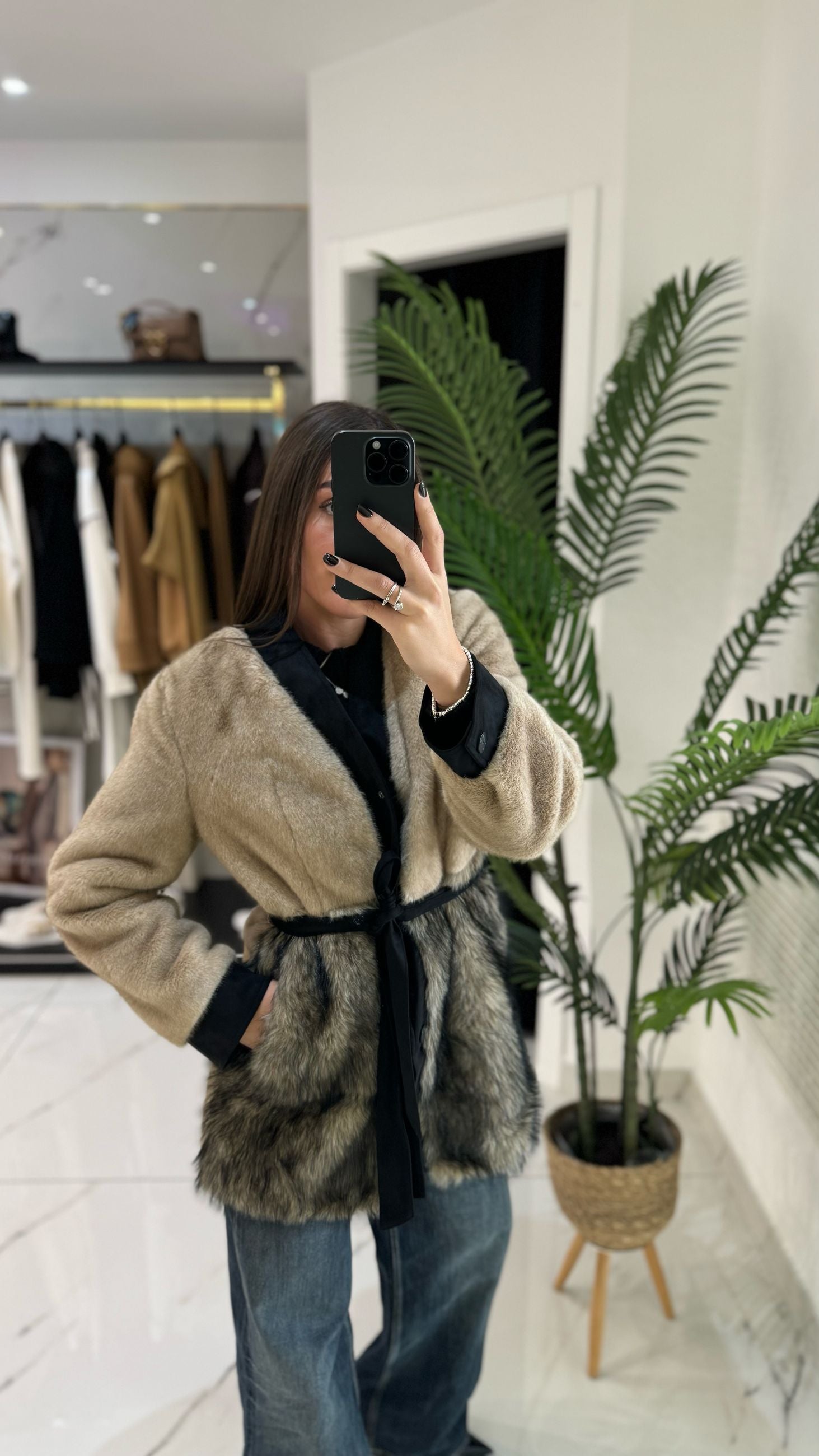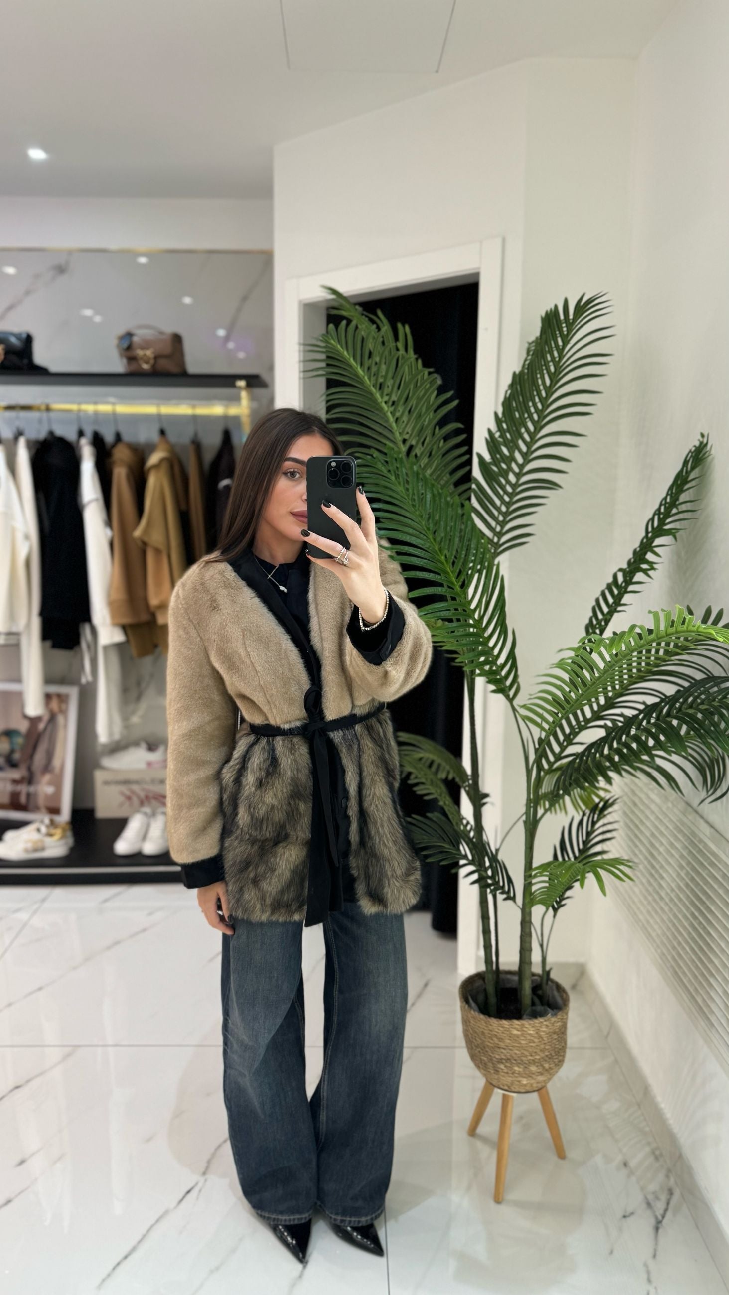 Giacca/Cappotto in ecopelliccia con chiusura con bottoni e dettaglio della cintura in vita.