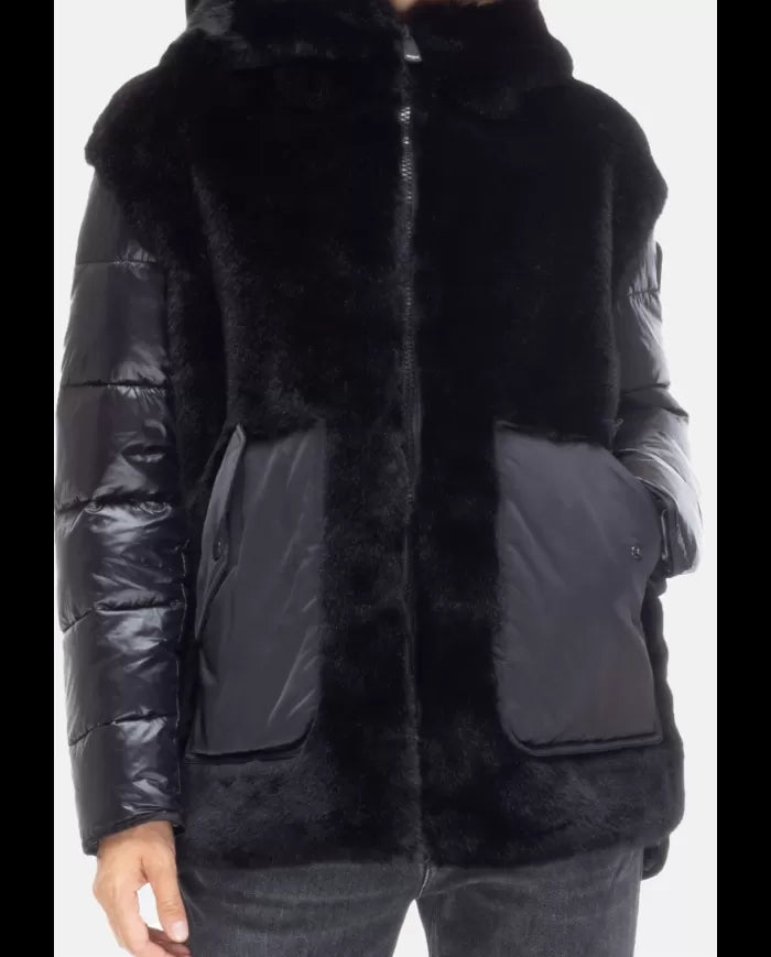 Piumino da donna caratterizzato da un design bimateriale con party in nylon trapuntato e parti in ecopelliccia. Cappuccio fisso con coulisse, tasconi con patta in nylon sul davanti. Patch logato con strass sulla manica. Imbottitura in ovatta. Tessuto principale 50% poliammide 50% poliestere Imbottitura 100% poliestere