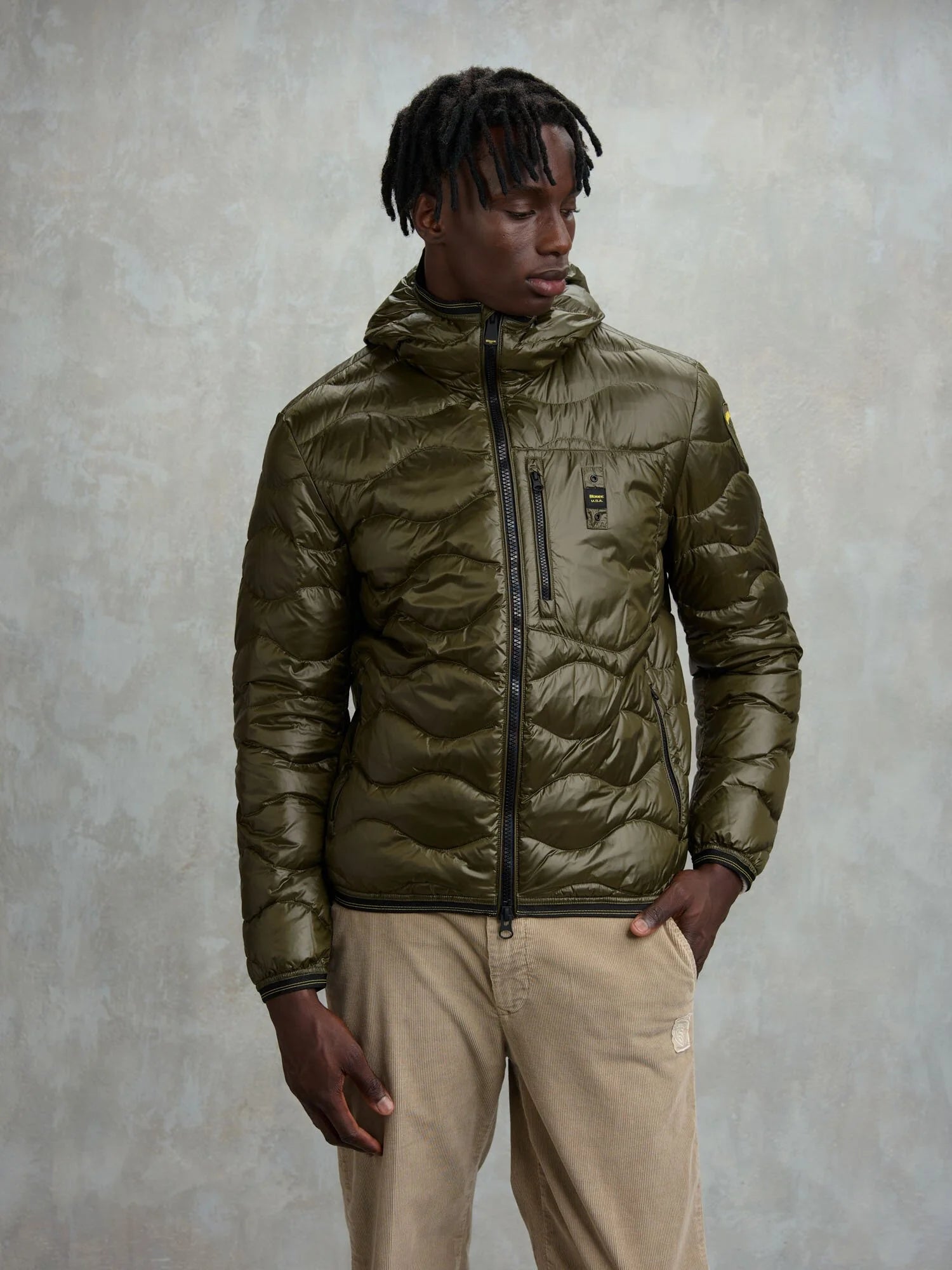 Piumino trapuntato ad onde orizzontali. Taschina applicata sul petto a sinistra per donare al capo iconico Blauer un tocco più funzionale. Imbottitura naturale in piuma, calda e non ingombrante; dedicato a chi vuole essere sempre alla moda in ogni occasione.