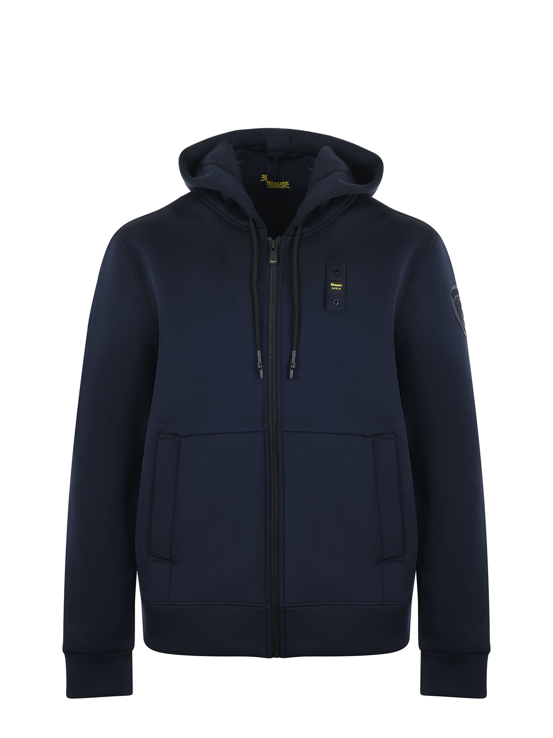 Felpa con cappuccio aperta sul davanti in tessuto scuba leggermente elasticizzato. Tessuto resistente allo schiacciamento e alla stropicciatura.