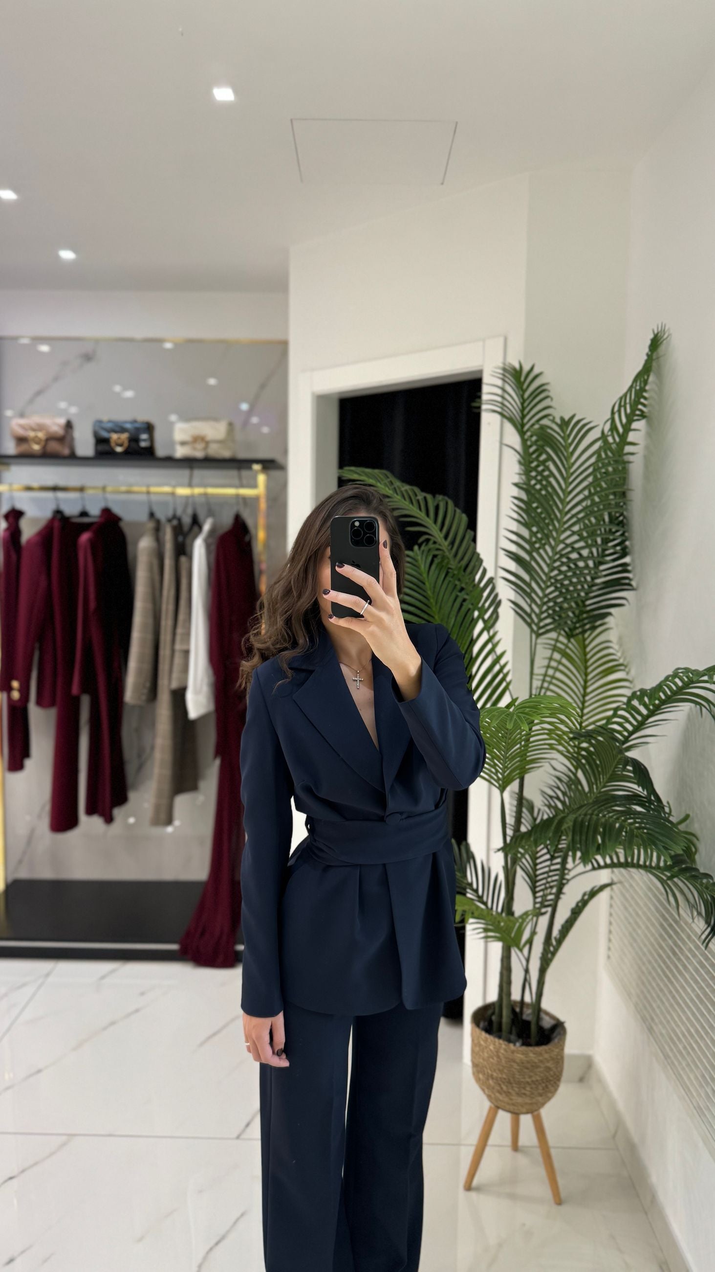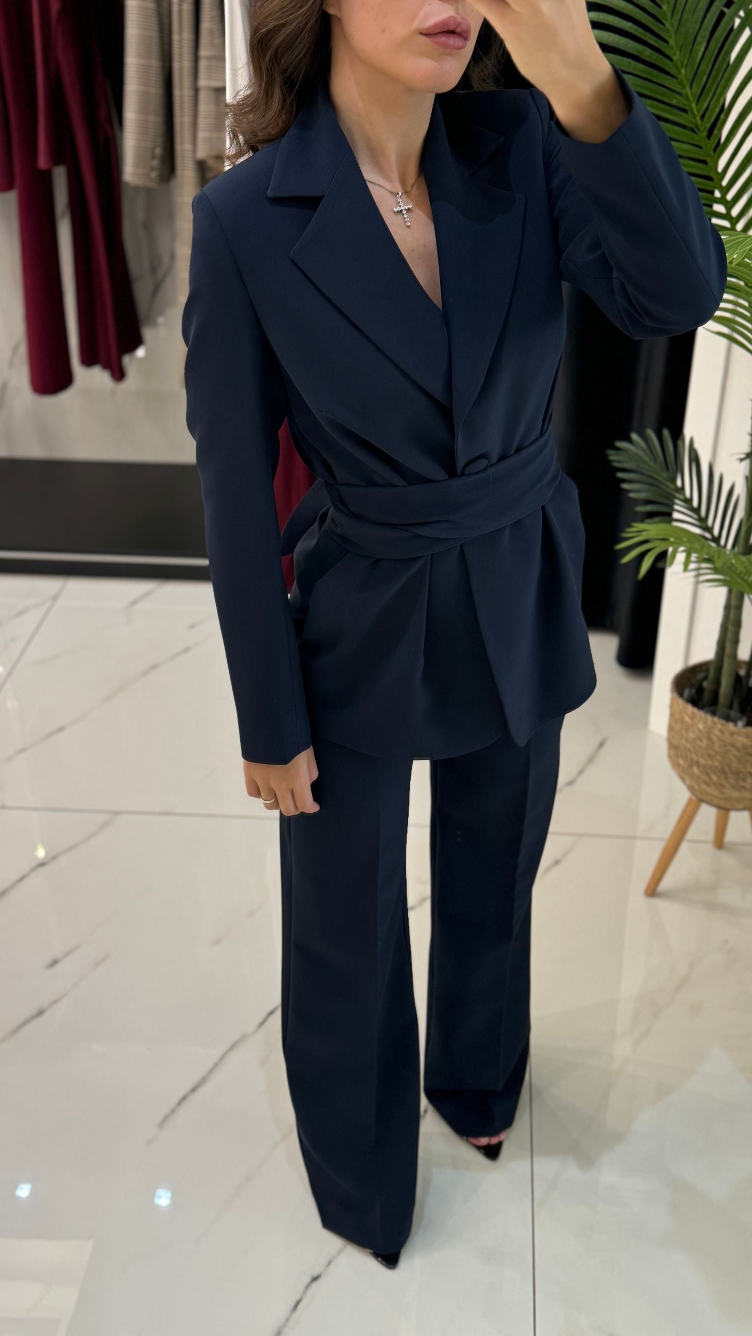 Giacca morbida con cintura e pantalone palazzo vita alta