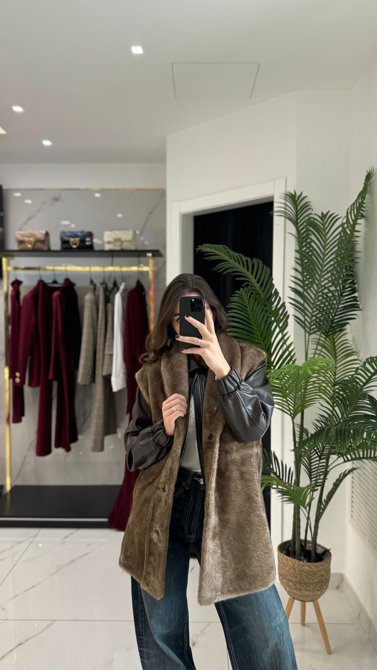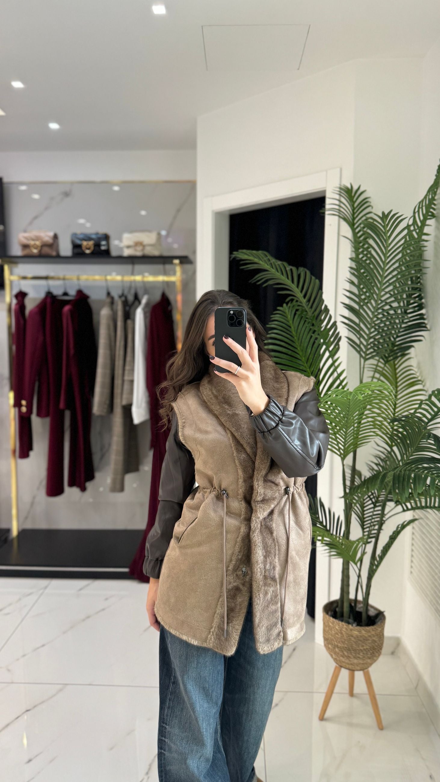 Gilet lunghezza media in ecopelliccia reversibile effetto montone con scollo sciallato.