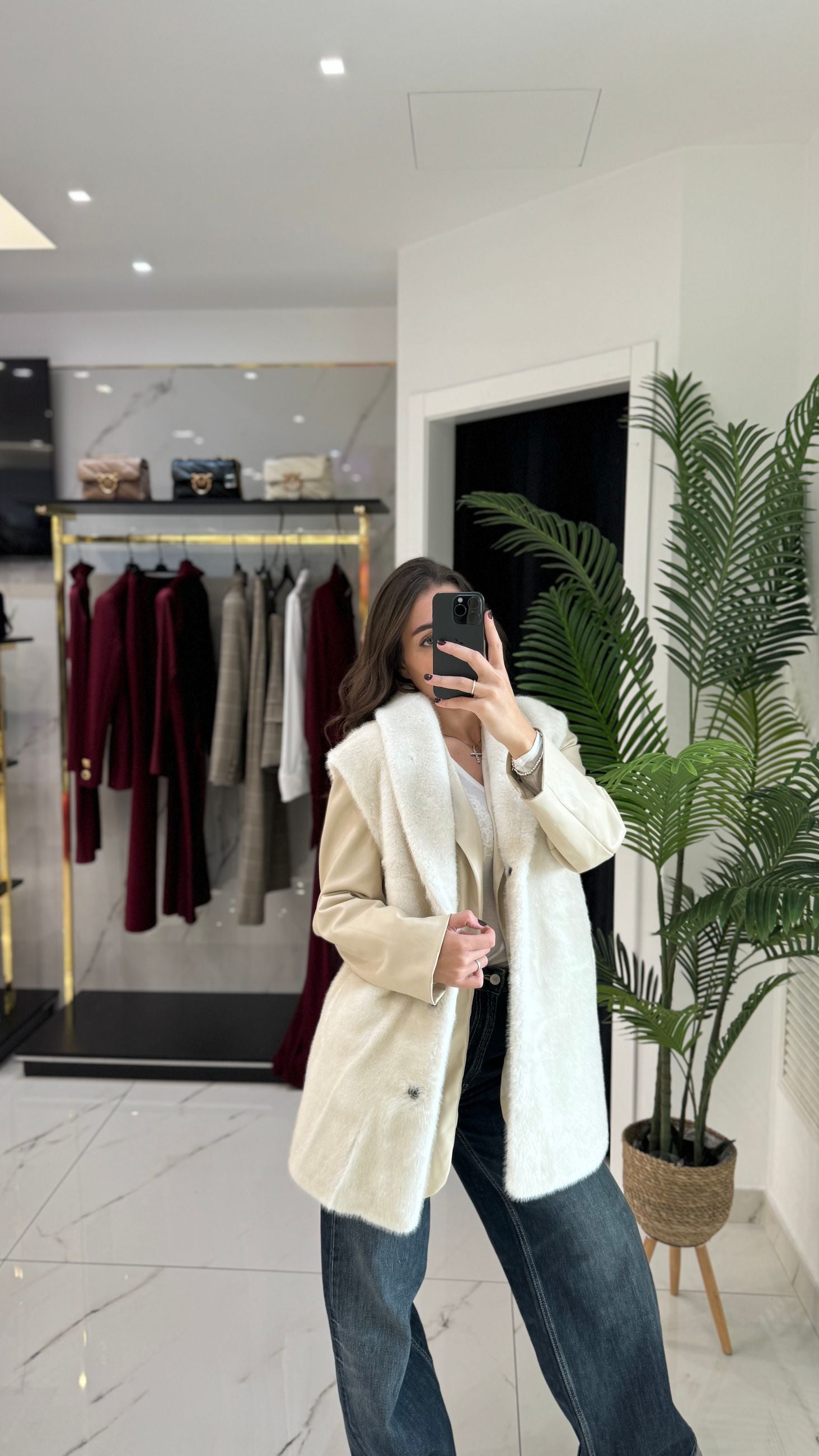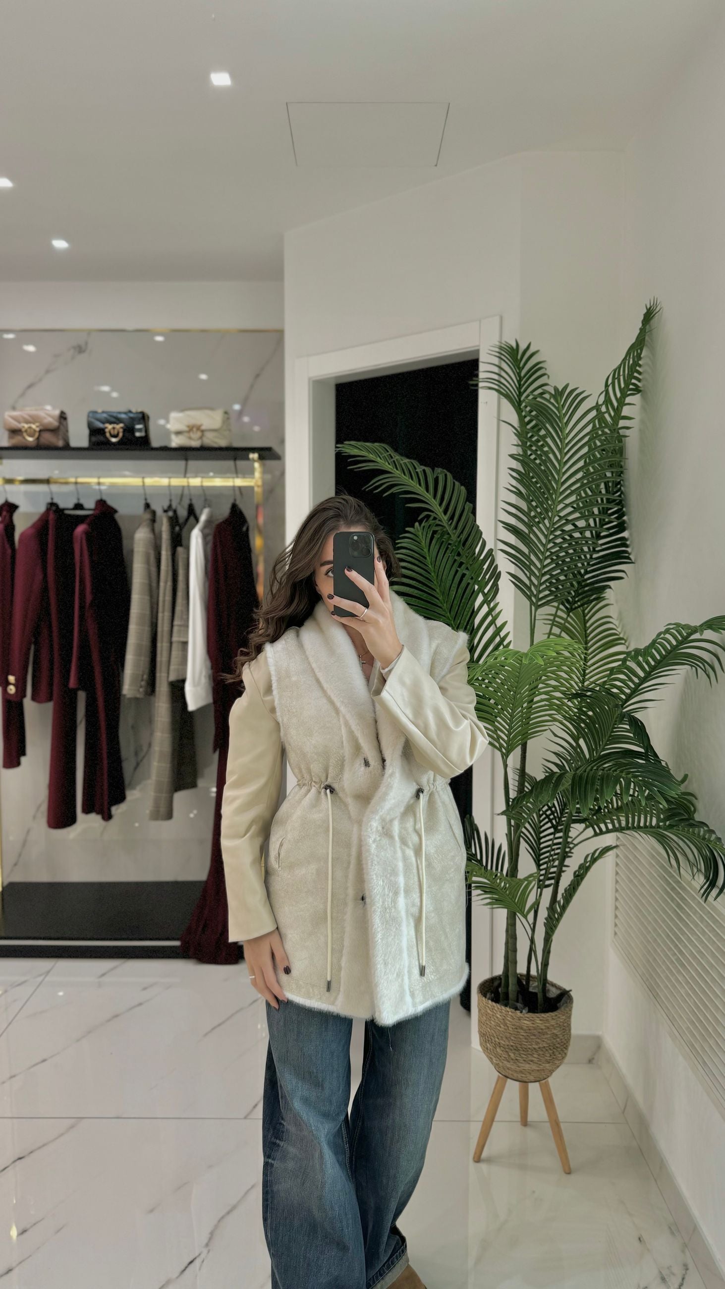 Gilet lunghezza media in ecopelliccia reversibile effetto montone con scollo sciallato.