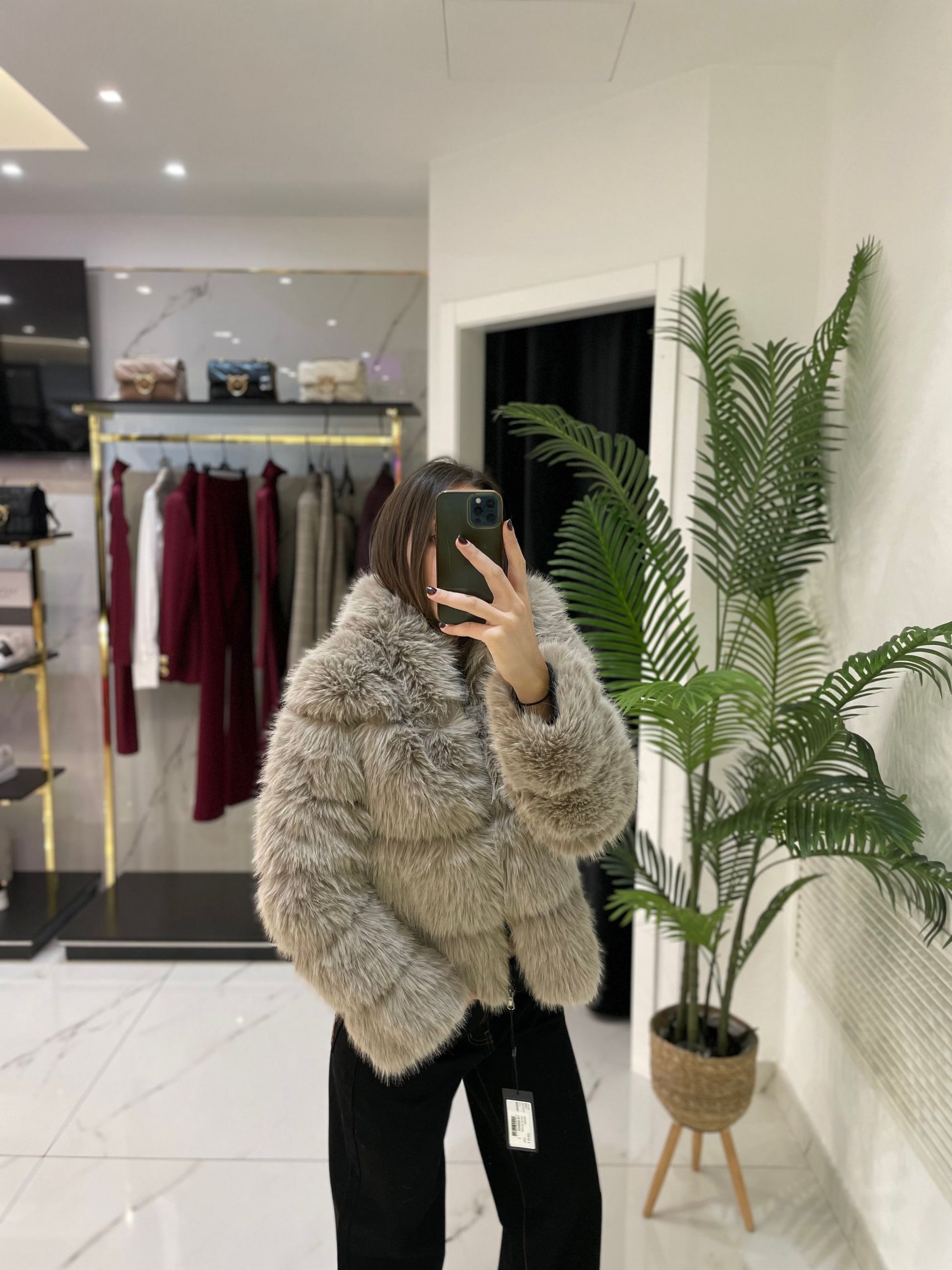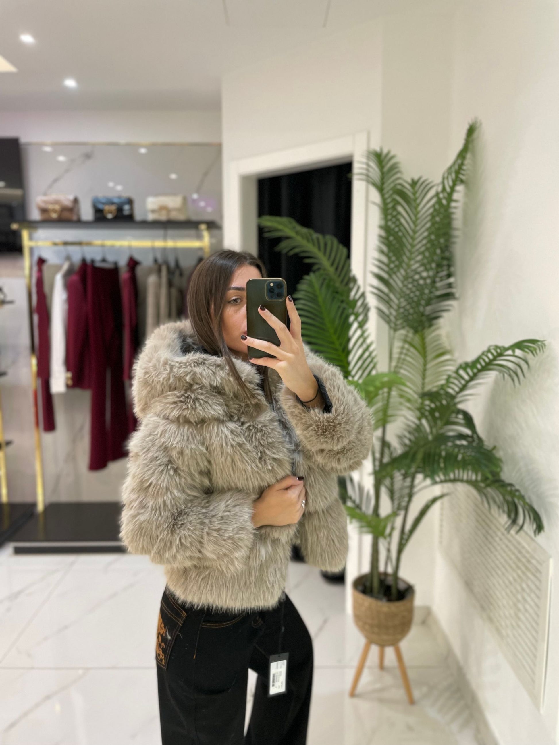 Giacca corta di ecopelliccia con chiusura zip e cappuccio.