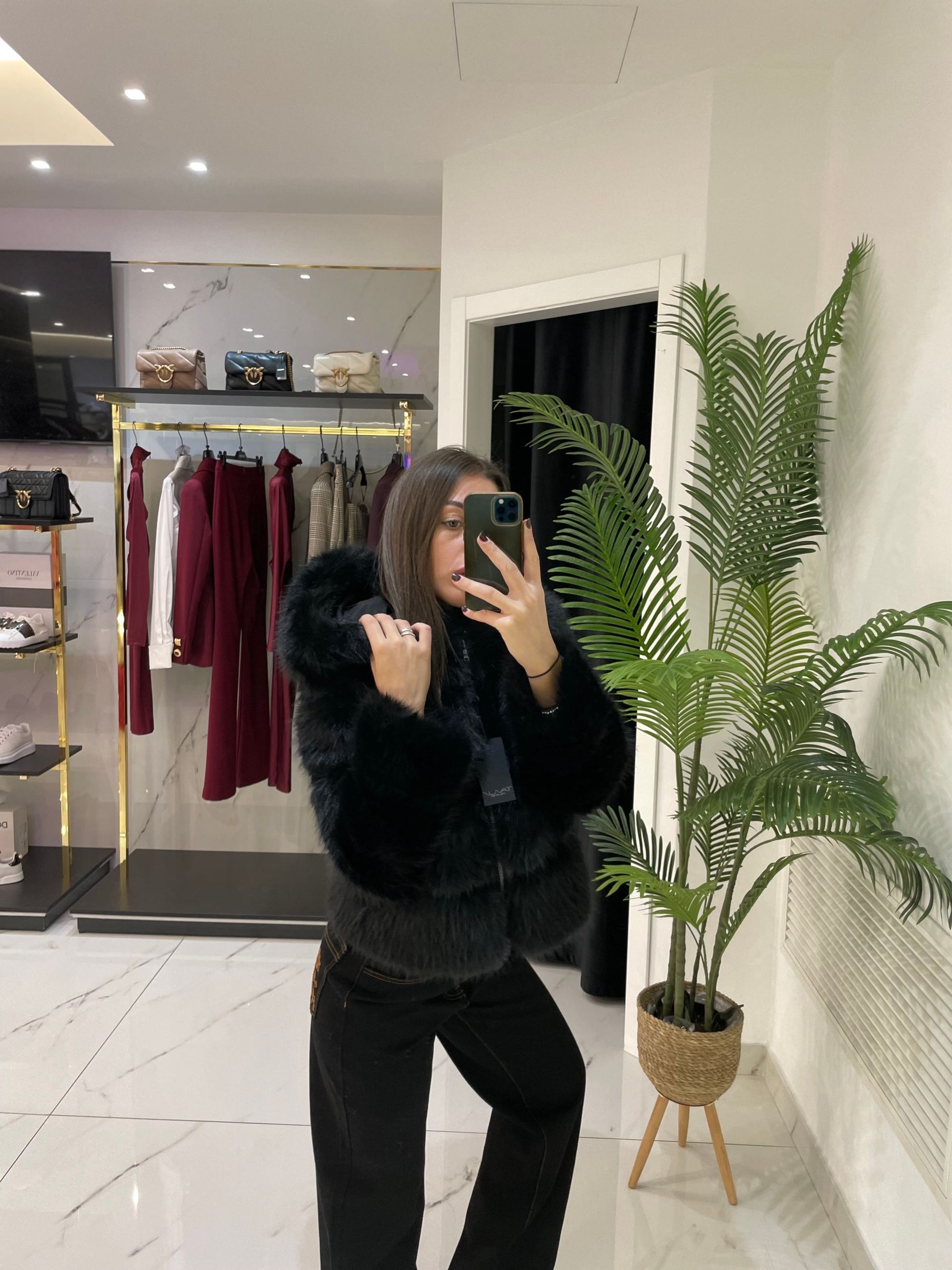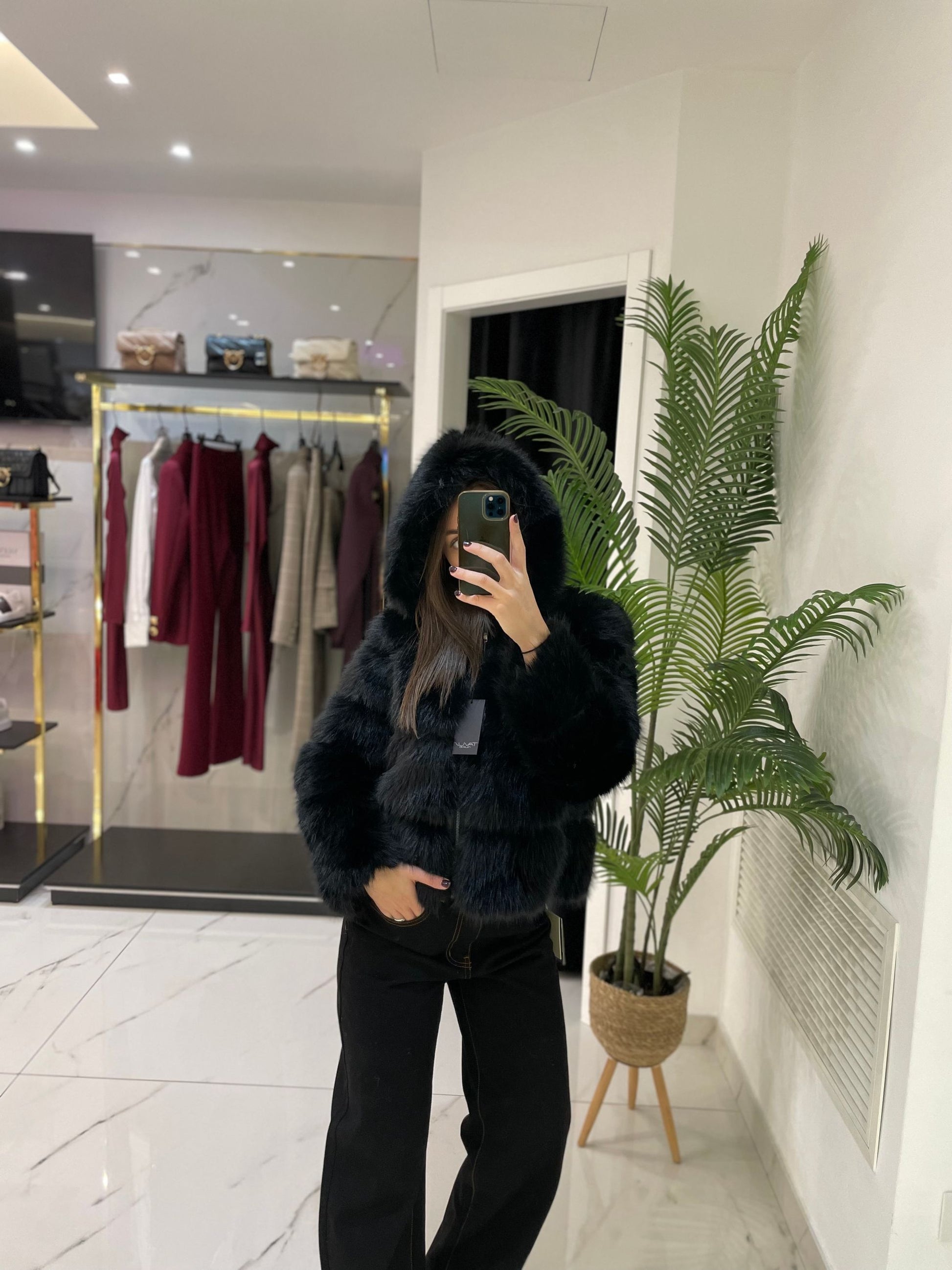 Giacca corta di ecopelliccia con chiusura zip e cappuccio.